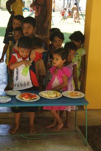 Varje dag får barnen frukt till mellanmål. Det kan vara klurigt att plocka upp frukten med tången. Runt omkring skolan växer träd med bananer, kokosnötter, mango och cashewnötter. Ser du vilken frukt det är?