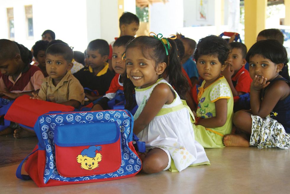 På Sri Lanka äter man ofta ris, curry och ett tunt, friterat bröd som heter pappadam. I curryn blandar man ner kött, fisk eller grönsaker och kryddor som kanel, curry och kardemumma. Saduni och hennes skolkompisar har fått varsin Bamse-väska i present. I väskorna ligger det målarböcker, pennor och tandborstar.