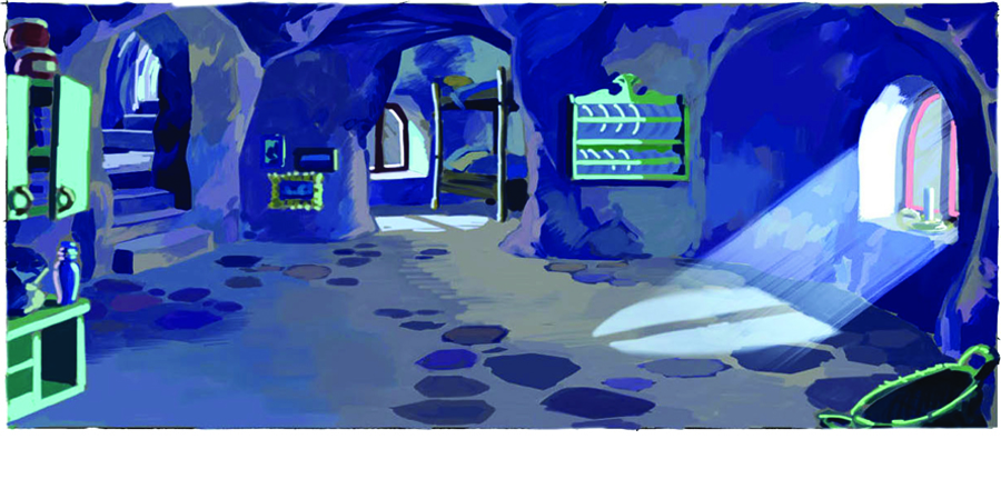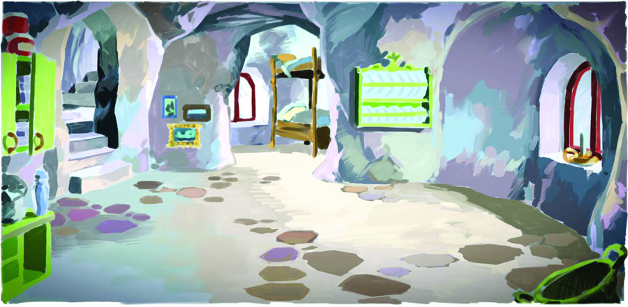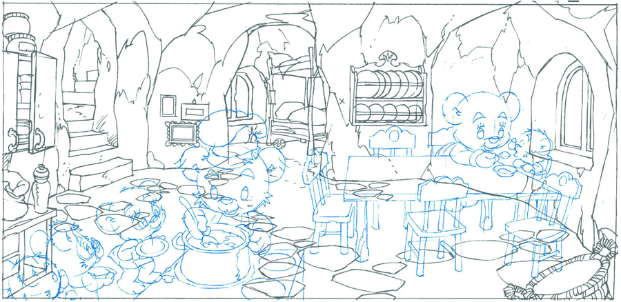 Här är det matdags hos Bamse och hans familj. Här är själva bakgrunden och allt annat som inte rör eller flyttar på sig i filmen tecknat med blyerts. Figurerna och allt annat är tecknade med blått. Bakgrunden målades sedan för sig, utan figurer.