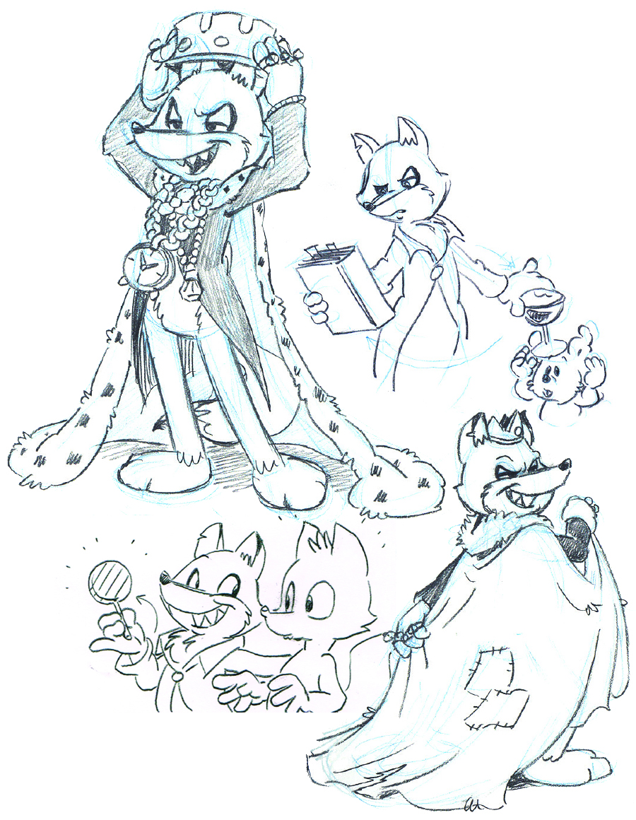 Reinard Räv! Bara namnet får skogens smådjur att darra i knävecken. På det här uppslaget kan ni se hur tecknaren arbetat med olika uttryck för att få fram Reinards personlighet i bilderna. Han är arrogant, självsäker och har höga tankar om sig själv. Inte särskilt genomtrevlig alltså.