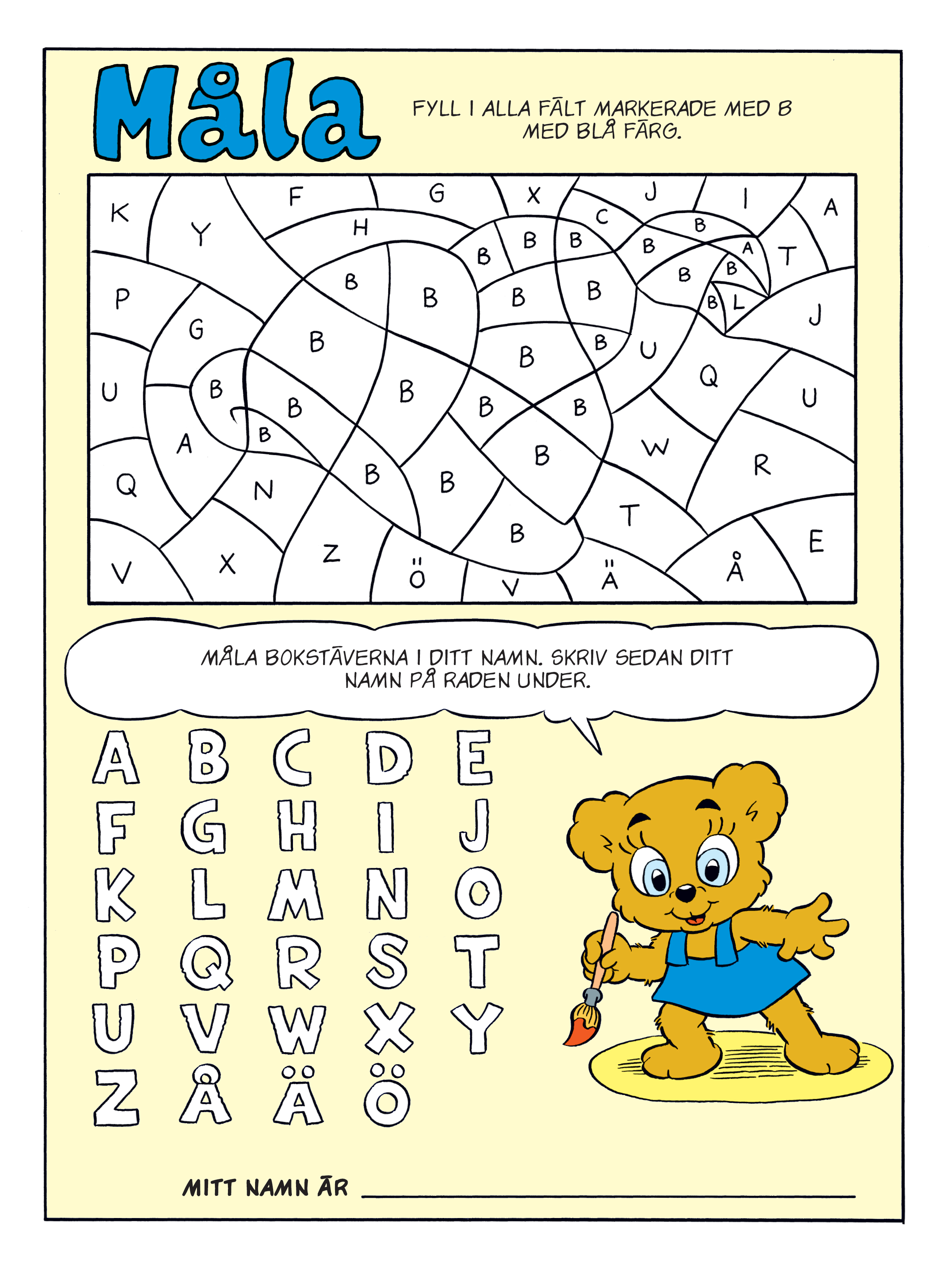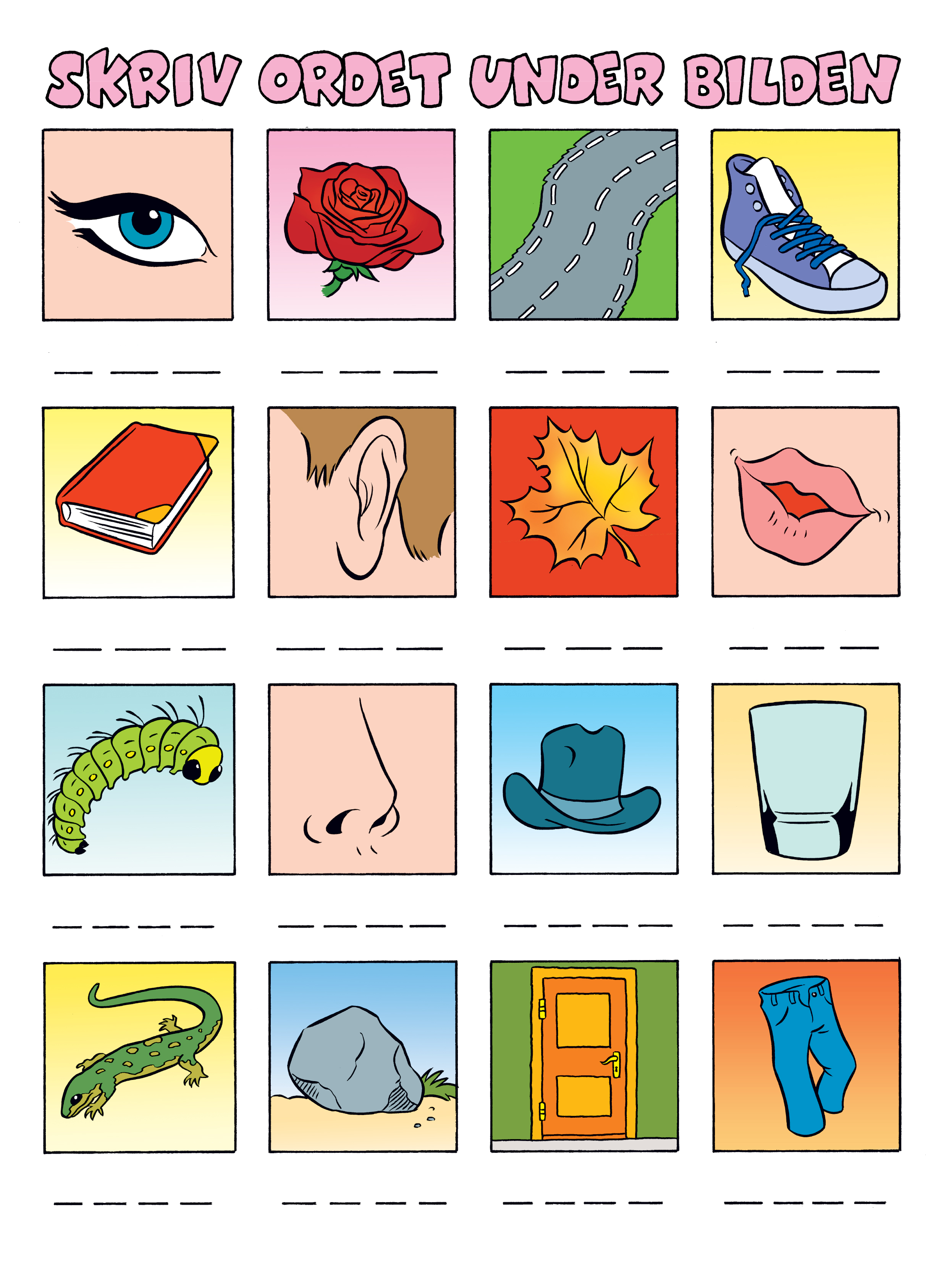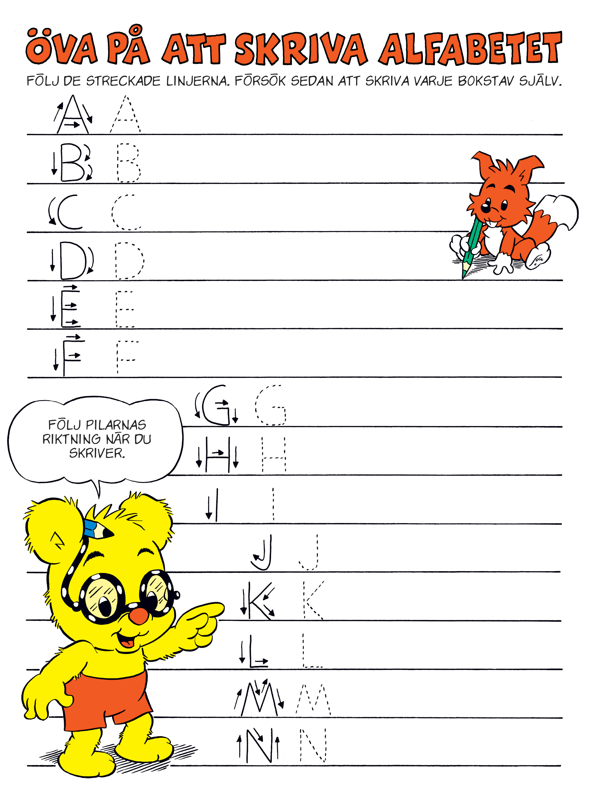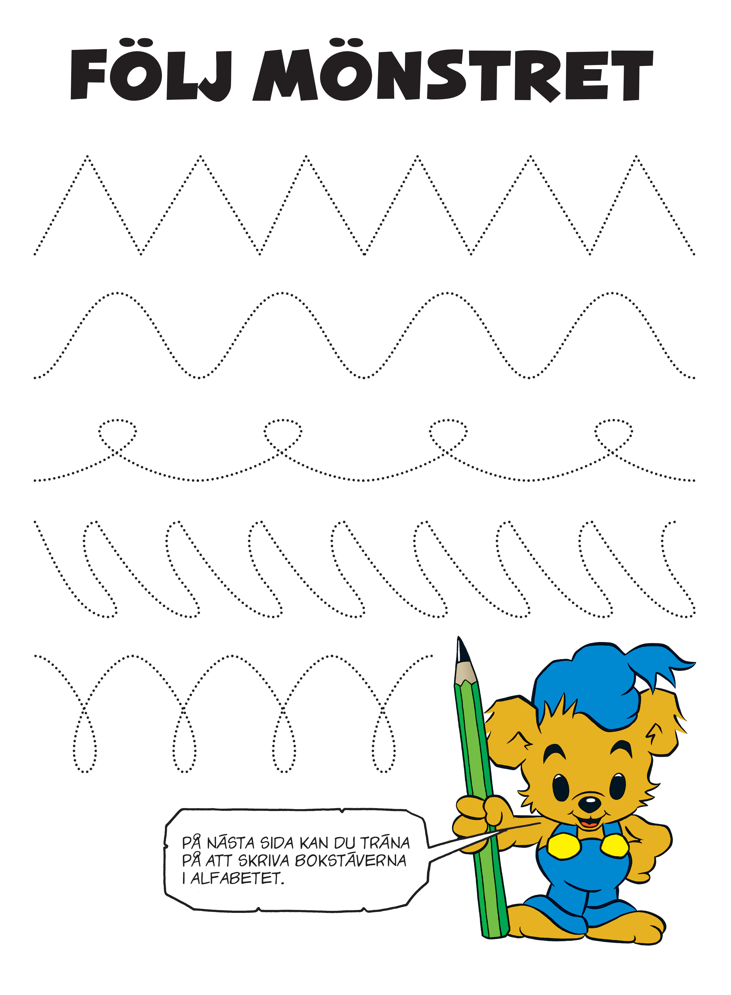 Här finns övningar i varierande svårighetsgrad – från att följa linjer till att skriva bokstäver och bilda ord.