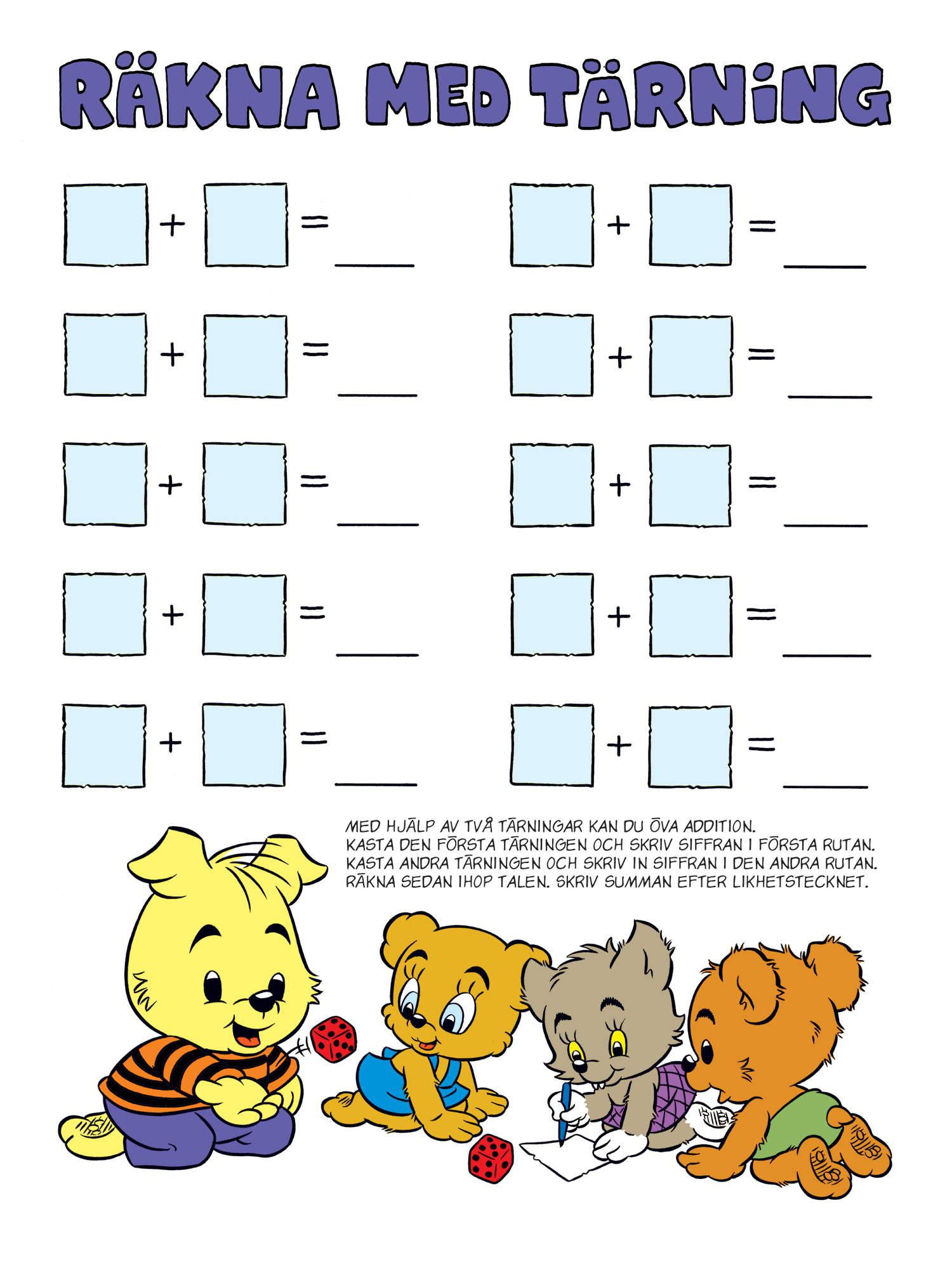 Exempel på sånger och ramsor som innehåller räkning är ”Fem små apor” och ”Fem fina fåglar”. Texterna hittar du lätt på internet (på Youtube kan man även hitta klipp där barn sjunger dessa).