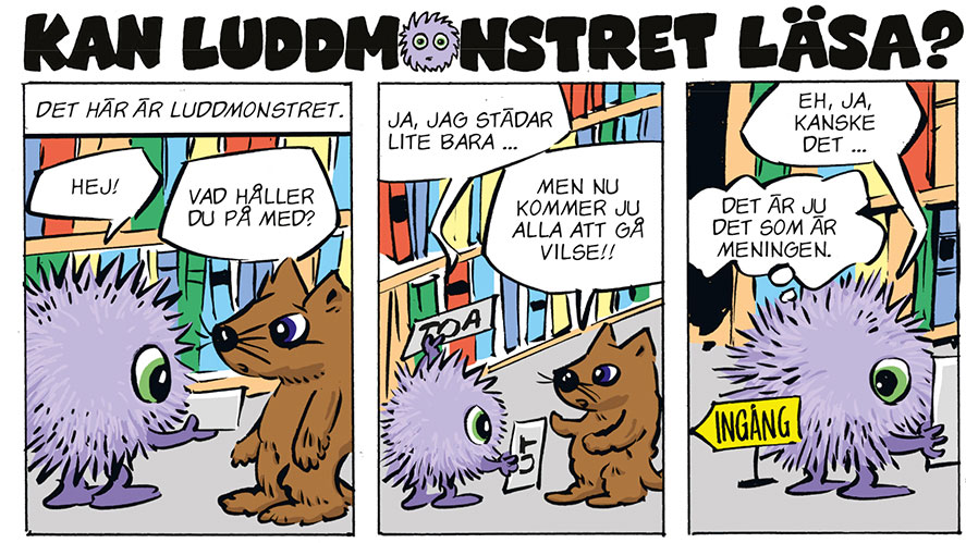 | Utdrag ur serien “Kan Luddmonstret läsa?”. Idé av Elin Pettersson, teckningar Johan Unenge. |