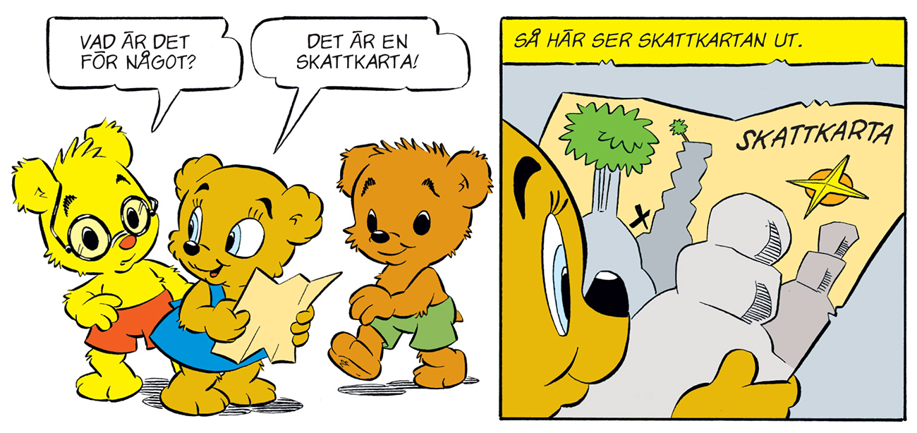 Trillingarnas tråkiga dag blir plötsligt väldigt spännande när de hittar en gammal skattkarta. Vad för skatt tror du att det är? Följ med på jakten i senaste numret av Bamse!