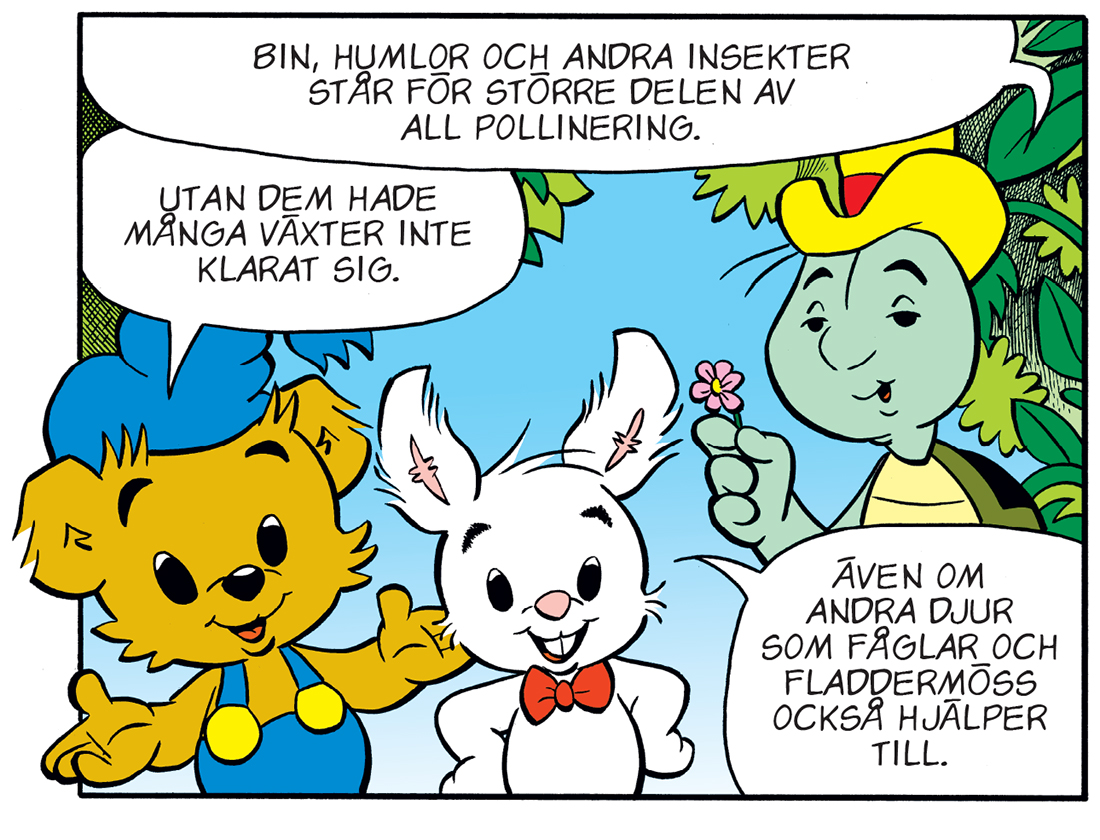Visste du att vi människor är helt beroende av bin och andra insekters livsviktiga arbete? Ungefär en tredjedel av den mat vi äter är pollinerad av dem. Pollinering betyder att pollen flyttas mellan olika blommor för att det ska kunna bildas nya frön. I tidningen får du lära dig mer om hur det fungerar.