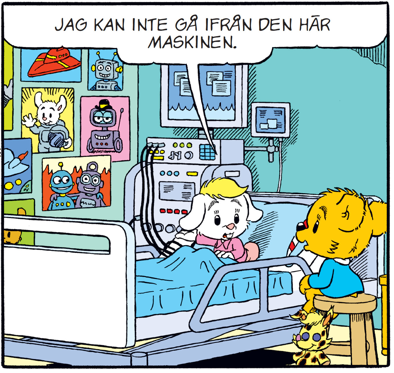 Bamse och Lille Skutt är på lekplatsen med Mini-Hopp och Brumma. Mini-Hopp skadar foten så de åker till sjukhuset. Där träffar de barn som inte kan lämna sjukhuset, då bestämmer de sig för att göra något speciellt för dem.