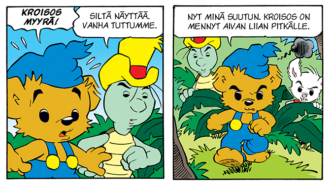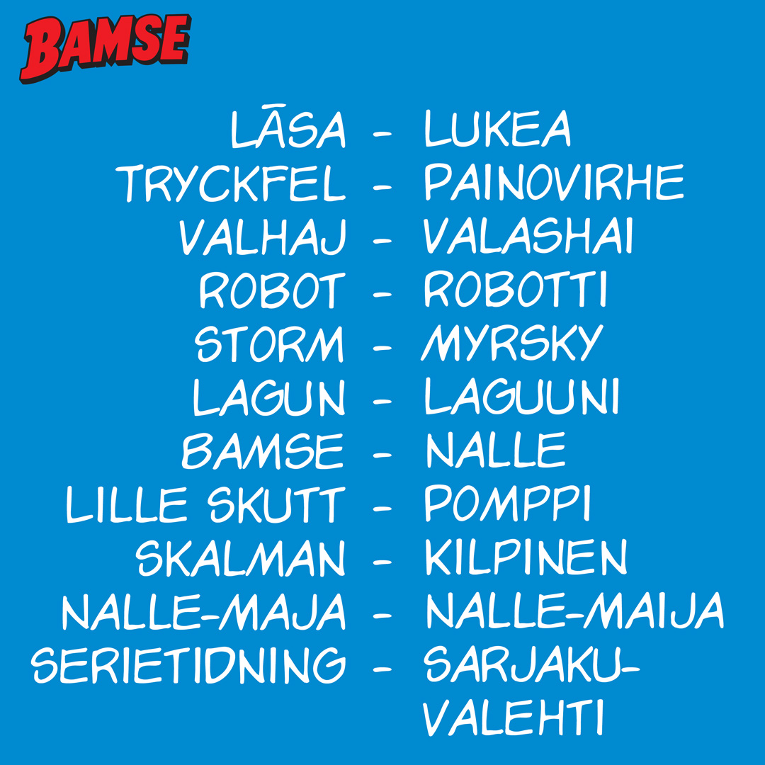 I nu aktuella Bamse nr 15 har det tyvärr smugit sig in 16 finska sidor. Alla prenumeranter kommer att få nya svenska tidningar senast i mitten av nästa vecka. Så länge kan man passa på att lära sig några nya, roliga och spännande ord från vårt östra grannland.