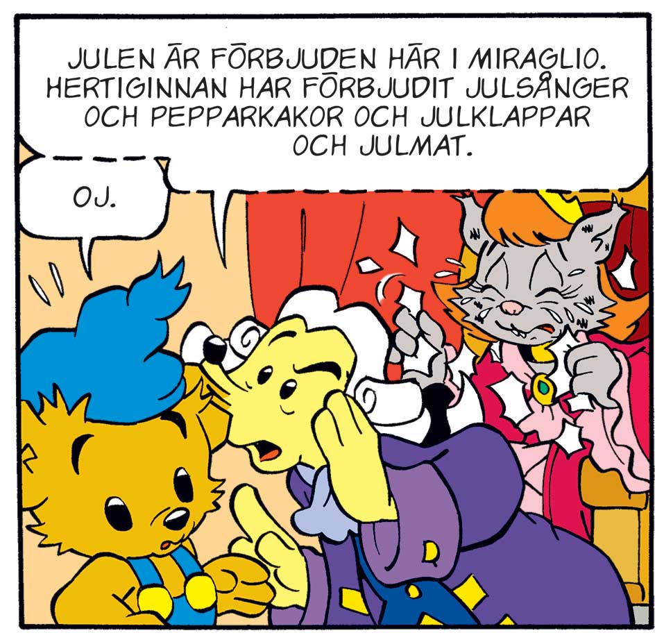Tänk om julen vore förbjuden där du bor. Inga julsånger, pepparkakor, julklappar eller julmat. Så är det i Miraglio där hertiginnan Bianca styr och ställer. Dit beger sig Bamse en vinter för att leverera ett julkort. Inte långt därefter dyker en jultomte som är misstänkt lik Krösus Sork upp i Miraglio. Utan att avslöja för mycket kan vi berätta att hertiginnan inte blir mycket glad över deras besök.