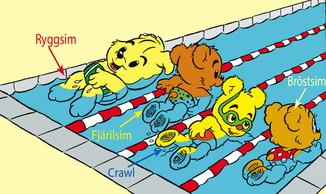 Det finns fyra olika simsätt att välja mellan när du ska simma – fjärilsim, ryggsim, bröstsim och crawl. Det är roligt att lära sig simma på olika sätt, så prova gärna på alla de olika simsätten. Vilket blir din favorit? Läs om de olika simsätten nedan och hur du kan öva på dem.