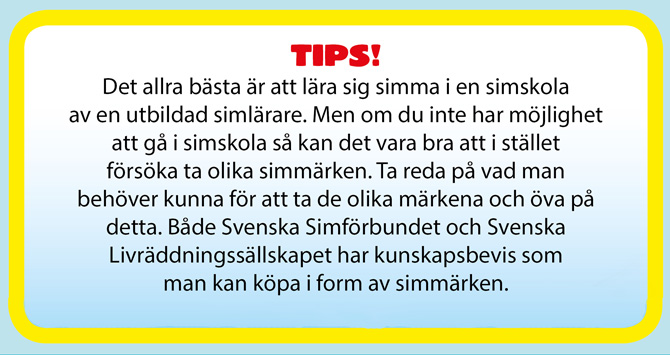 - När du övat på bensparken kan du lägga dig på rygg, börja simma med benen och sedan tar du ett armtag i taget i lugn takt. När du övat lite kan du prova att öka farten lite på armarna.