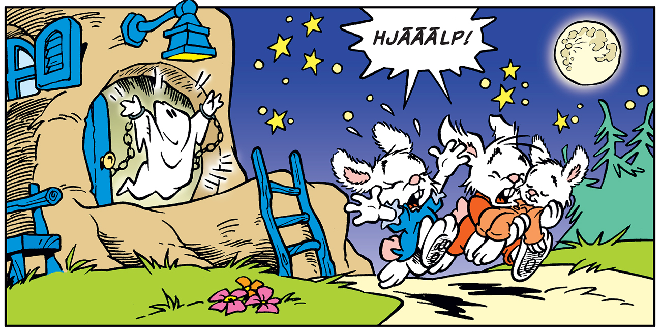 En natt vaknar Lille Skutt och Nina av att deras täcke dras undan. Framför dem svävar ett ruskigt spöke. De flyr i panik hem till Bamse och berättar vad som har hänt. Var det ett riktigt spöke, eller finns det en annan förklaring?