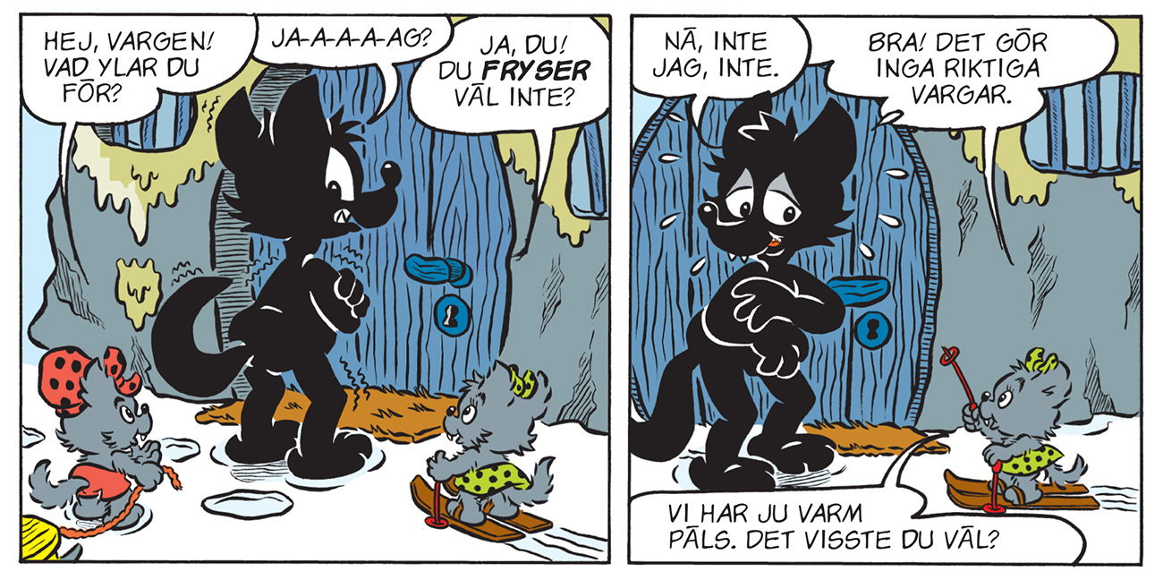 Vargen åker kälke utan några kläder, fast att det är mitt i vintern. Till sist är han så kall att han skallrar tänder, men fryser riktiga vargar egentligen? Det får du veta i tidningen!