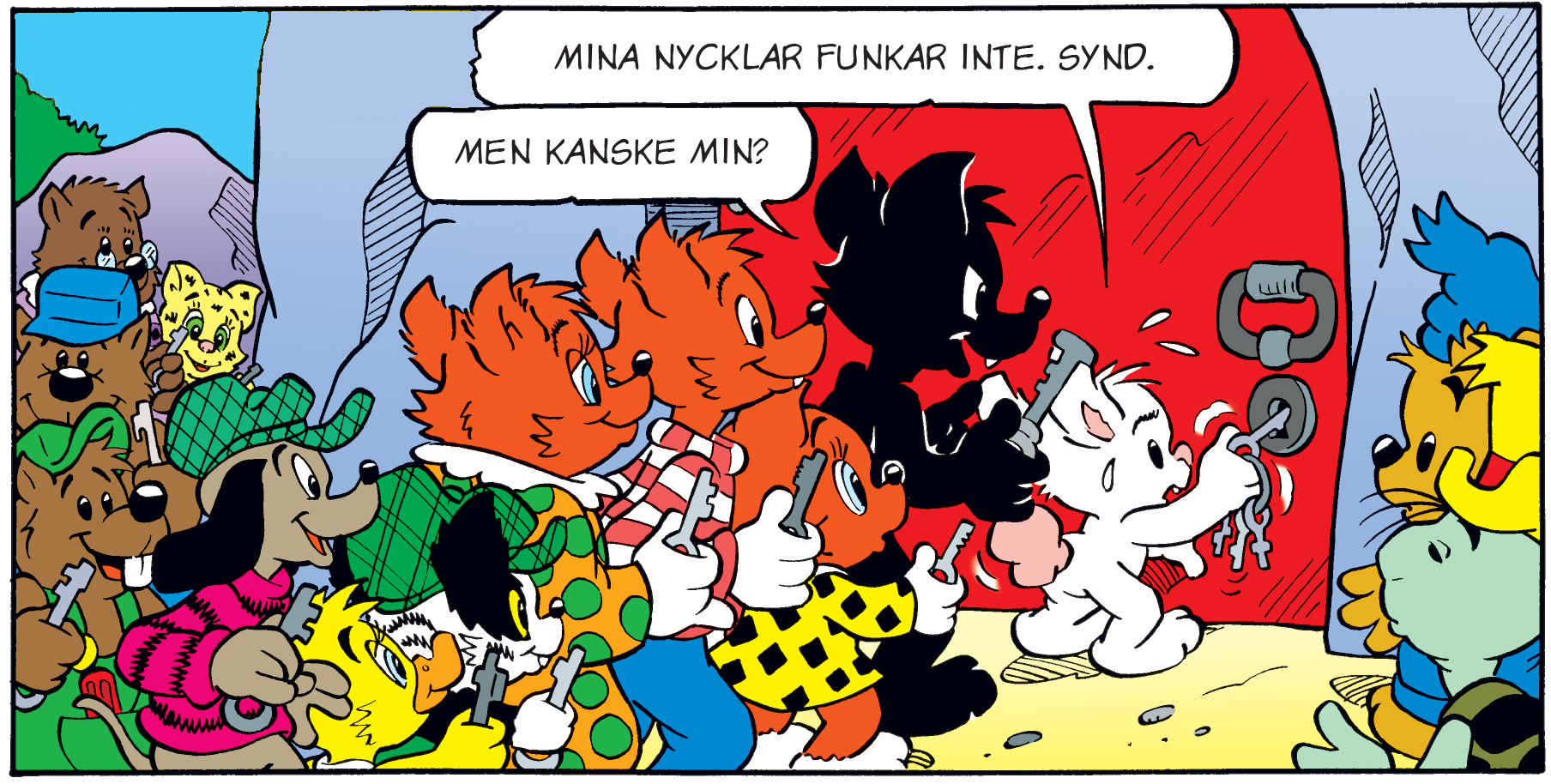 Bamse och Skalman ger sig iväg för att hämta en magisk medicin som sägs finnas i en grotta. För att komma in i grottan måste de lyckas öppna dess stora röda port …