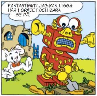 Skalmans mekaniske gubbe kan göra det mesta. Kan han hjälpa till i Lille Skutts morotsland eller till och med arbeta i Krösus Sorks fabrik?