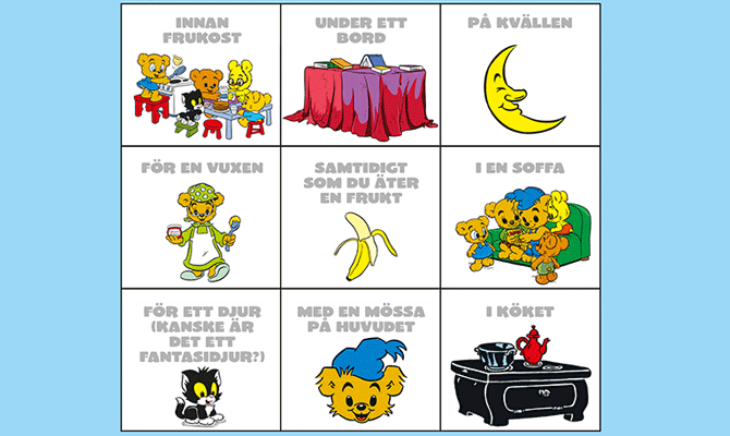 Du kan läsa böcker eller serietidningar. Läs i en kvart för att få kryssa en ruta. Om du inte kan läsa själv får du be en vuxen eller ett syskon att läsa högt för dig. Kanske får du bingo (tre rutor i rad) ganska fort?