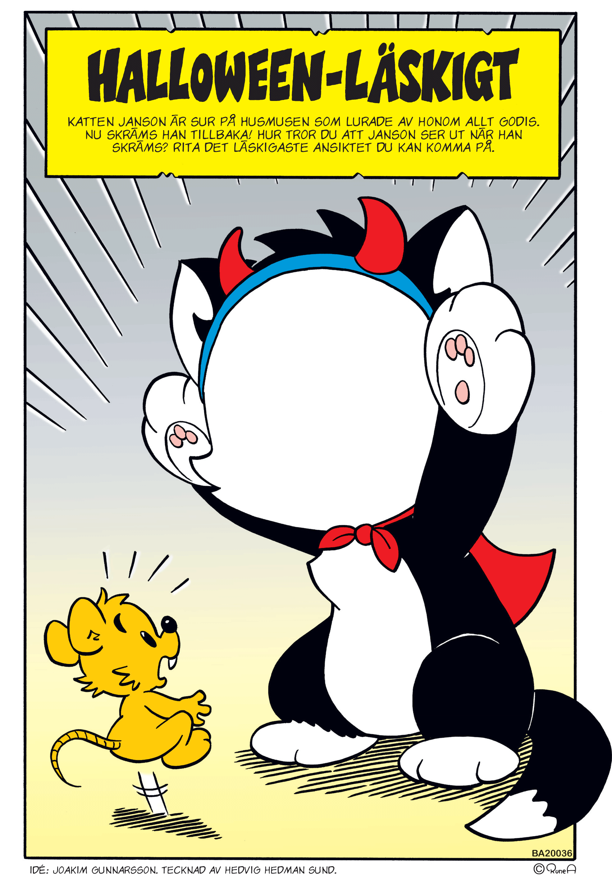 Snart är det Halloween och då kan det vara roligt med lite läskigt pyssel. Hur tror du att Katten Janson ser ut när han skräms? Skriv ut teckningen nedan och rita det läskigaste ansikte du kommer på!