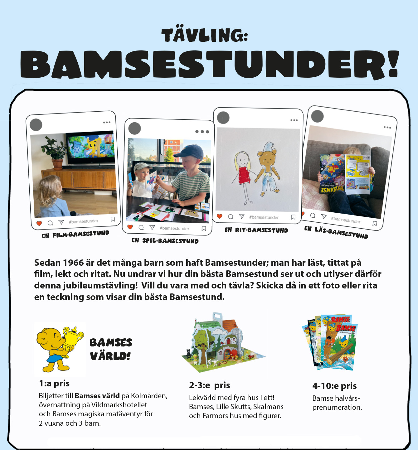 Sedan 1966 är det många barn som haft Bamsestunder; man har läst, tittat på film, lekt och ritat. Nu undrar vi hur din bästa Bamsestund ser ut och utlyser därför denna jubileumstävling! Vill du vara med och tävla? Skicka då in ett foto eller rita en teckning som visar din bästa Bamsestund.