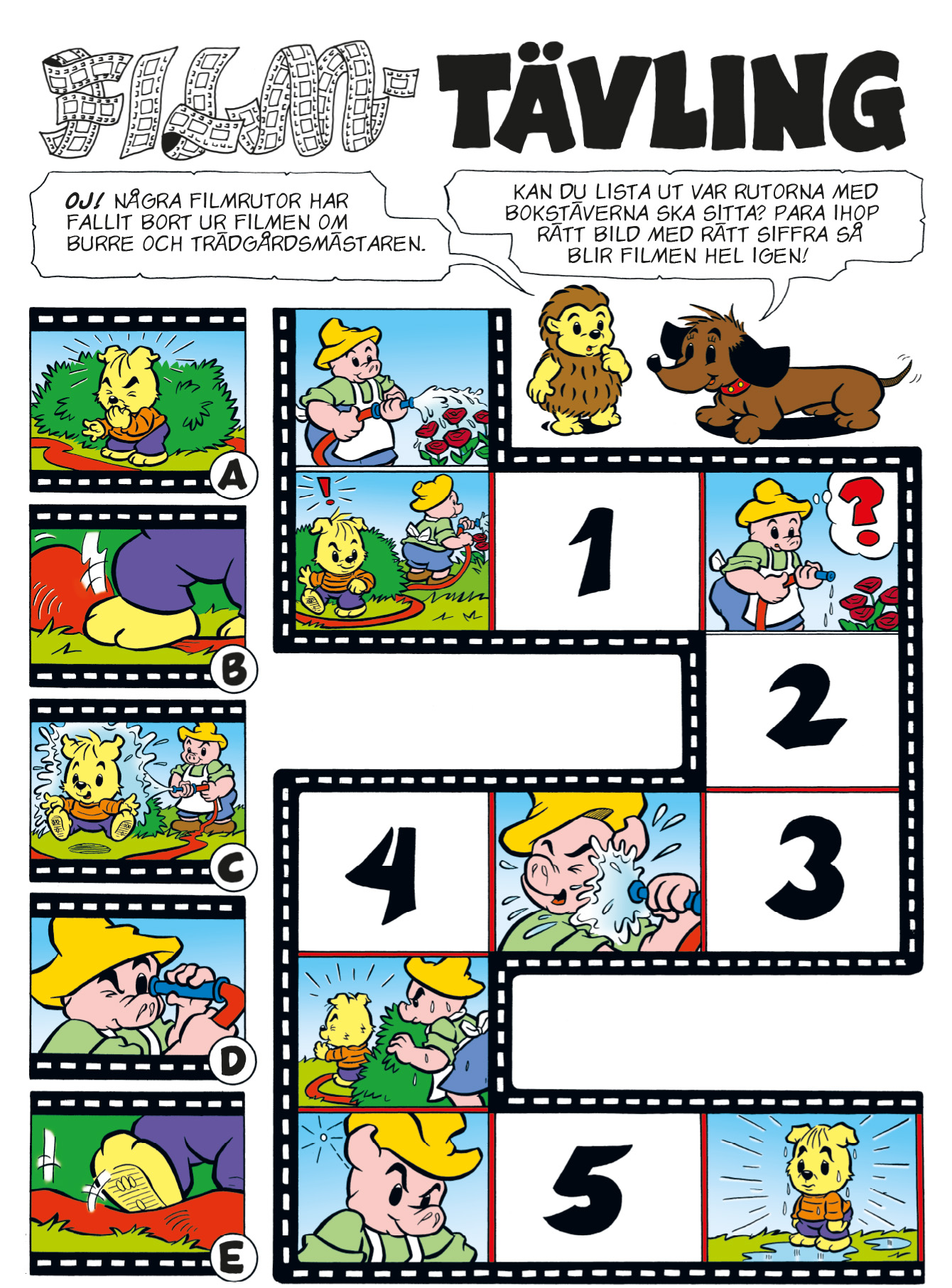 Några filmrutor har fallit bort ur filmen om Burre och trädgårdsmästaren. Kan du lista ut var rutorna med bokstäverna ska sitta? Para ihop rätt bild med rätt siffra så blir filmen hel igen!