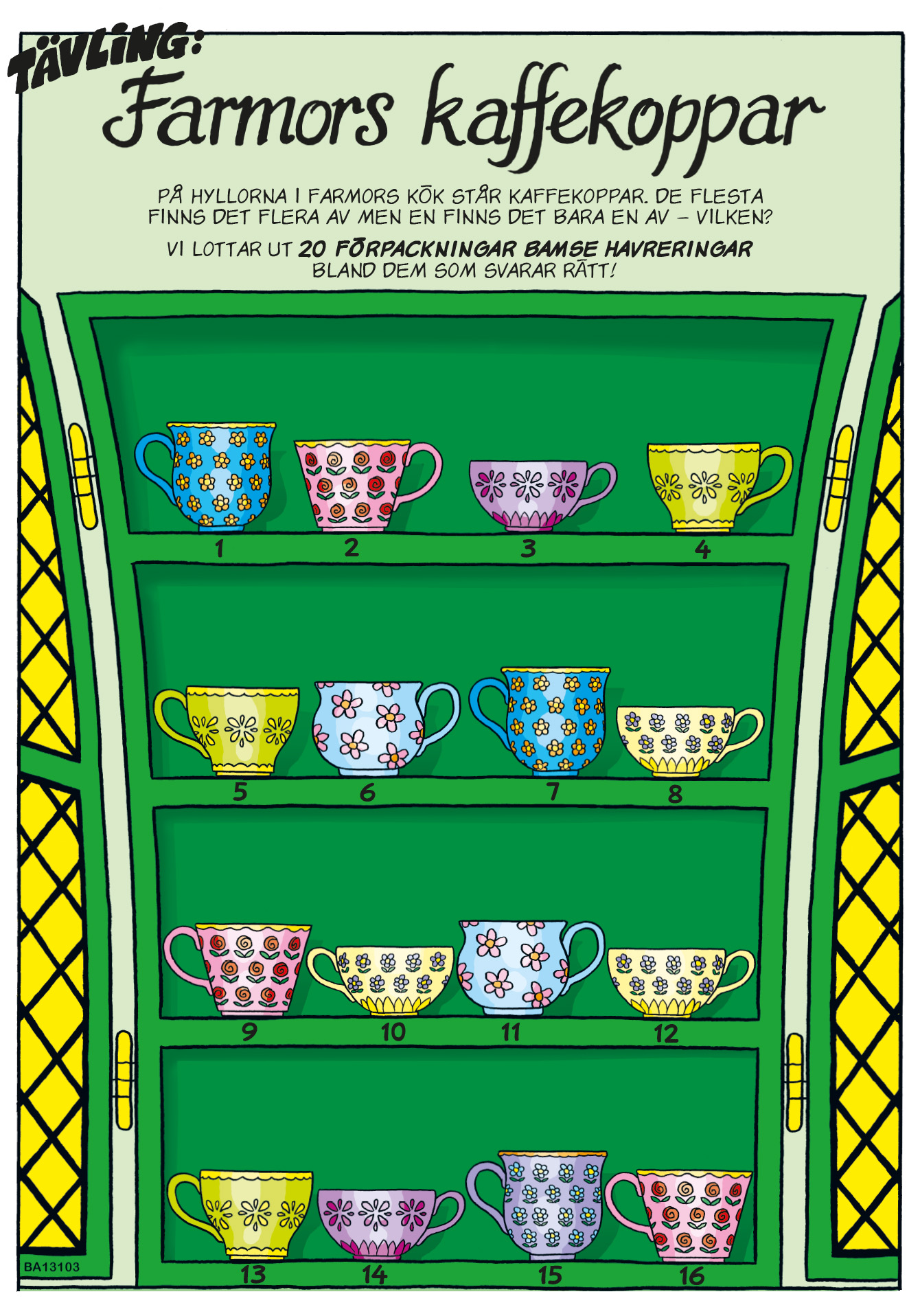 På hyllorna i Farmors kök står kaffekoppar. De flesta finns det flera av men en finns det bara en av – kan du se vilken? Skriv in rätt siffra som står under kaffekoppen.