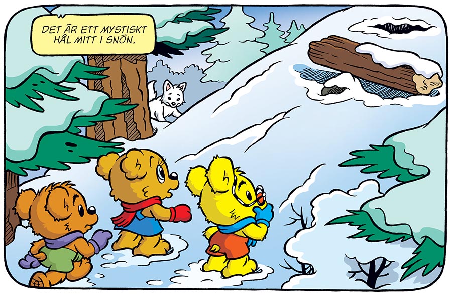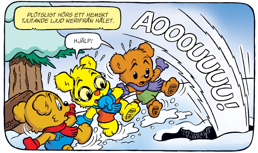 I aktuella Bamse för de yngsta kan ni läsa berättelsen ”Det mystiska hålet”. Trillingarna gör en skidutflykt i skogen. De stannar för att fika. Just som Brum ska hälla upp varm choklad så får Nalle-Maja syn på något. Hon ser ett mystiskt hål mitt i snön. Och ur hålet kommer ett hemskt tjutande ljud! Är det en spökgrotta som de upptäckt? Eller ett monsterbo?